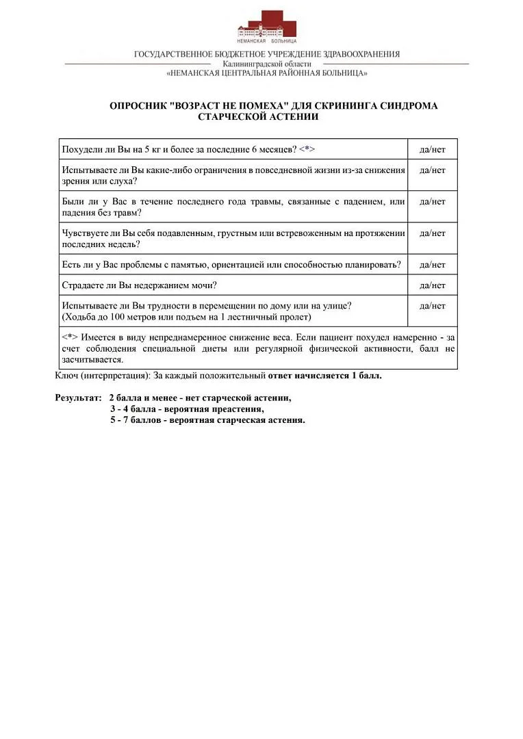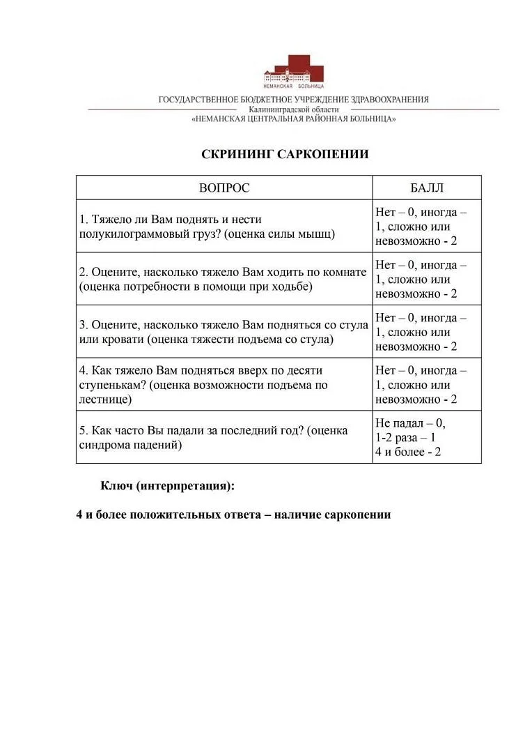 Подтверждение предварительного диагноза и определение тяжести ССА осуществляется при помощи Индекса Старческой Астении (ИСА) или индекса «хрупкости». В его структуре имеется 6 параметров, которые оцениваются в баллах. К ним относятся субъективная самооценка уровня здоровья, наличие соматических патологий из предоставленного списка (инсульты, ИБС, артрозы, сахарный диабет, ХОБЛ, артериальная гипертензия и другие), объективная оценка функционального состояния по ряду критериев, ИМТ, определение мышечной силы по результатам динамометрии, возможность быстрой ходьбы.