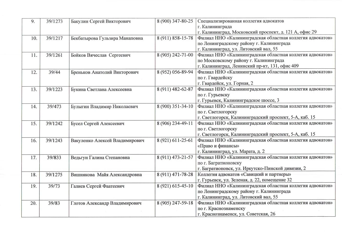 1. Государственное казенное учреждение Калининградской области «Государственное юридическое бюро»: г. Калининград, ул. Репина, 20, тел.: 95-68-13, 95-83-18. График работы: Пн - Пт 8:30 - 17:30, Обед: 13:00 - 14:00.