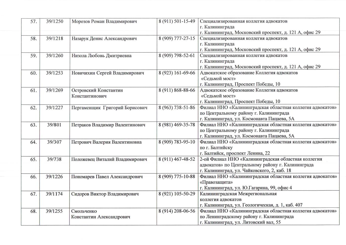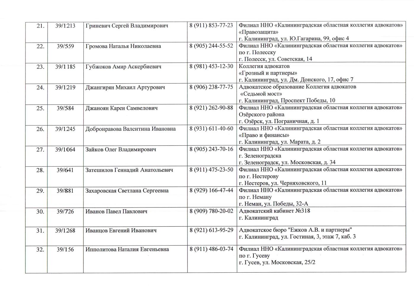2. Пункт бесплатной юридической помощи при Адвокатской палате Калининградской области: г. Калининград, ул. Литовский вал, д. 55, тел. 46-05-63. График работы: пн, вт, ср, чт, пт – с 10.00 до 13.00.
