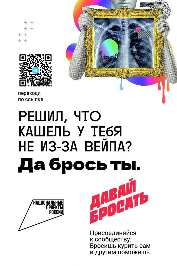 Помогает сказать «нет» курению электронных сигарет, вейпов и иных устройств сообщества «Давай бросать» в мессенджере «Телеграм» и в социальной сети «Вконтакте», которое развивается по нацпроекту «Продолжительная и активная жизнь».