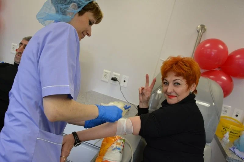 В передвижном комплексе, стоявшем на площади, сотрудники Областной станции переливания крови приняли 107 добровольцев. Было сдано 50,7 литра цельной донорской крови.